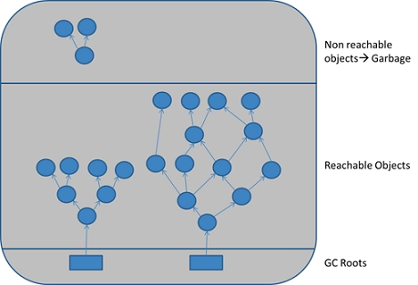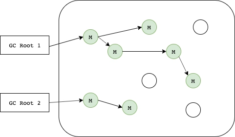 가비지 컬렉터에는 Heap영역 외부에서 접근할 수 있는 변수나 오브젝트를 뜻하는 GC Root라는 것들이 있다. GC Root에서 시작되어 이 Root가 참조하는 모든 오브젝트와 그 오브젝트가 참조하는 다른 오브젝트들을 탐색해서 내려가면서 마크(Mark)한다.