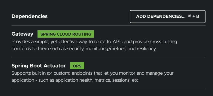 기본적으로 Spring Cloud Gateway가 필요합니다. Spring Cloud Gateway는 Spring Boot, Spring WebFlux를 비롯하여 다른 여러 의존성을 가지고 만들어진 아티펙트입니다. 그래서 Spring Data나 Security와 같은 다른 의존성들과 충돌하는 경우도 있으니 참고하여 주세요. Spring Initialzr를 사용하면 쉽게 구성할 수 있습니다.