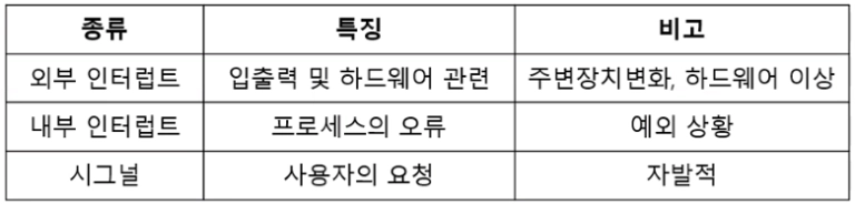 입출력장치로부터 오는 인터럽트 + 전원 이상 + 기계적인 오류 때문에 발생하는 인터럽트