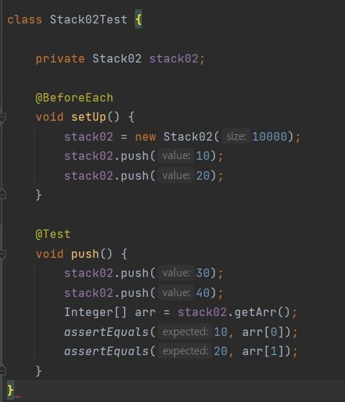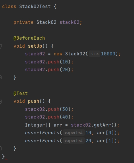 테스트 코드에서 스택 배열의 값을 활용하여 기댓값과 실제 스택의 반환값을 getArr() 메소드도 Stack 구현 클래스에서 작성해주어야 한다.