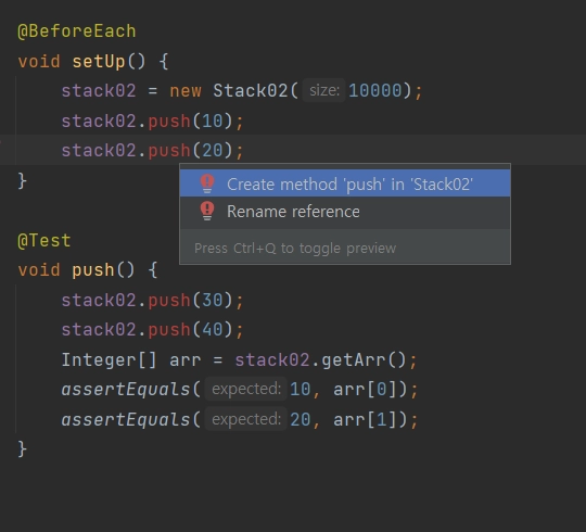 alt+enter를 클릭해 Stack02 클래스에 push() 메소드를 생성해준다.