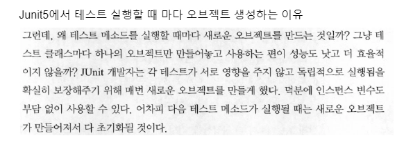 테스트 클래스는 인스턴스 변수를 매번 새로 생성해주기 때문에, 독립적인 실행을 확실하게 보장한다.