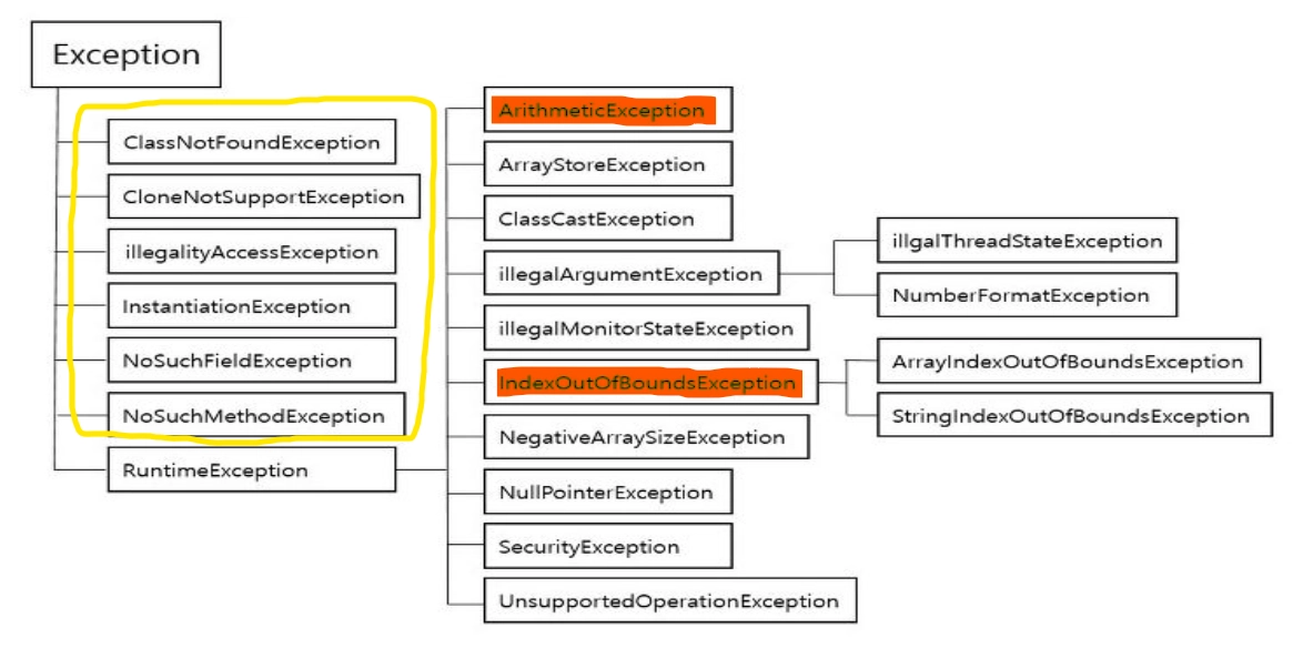 모든 예외 처리의 부모 예외처리가 있다. Exception 를 쓰면 다 처리가 된다.