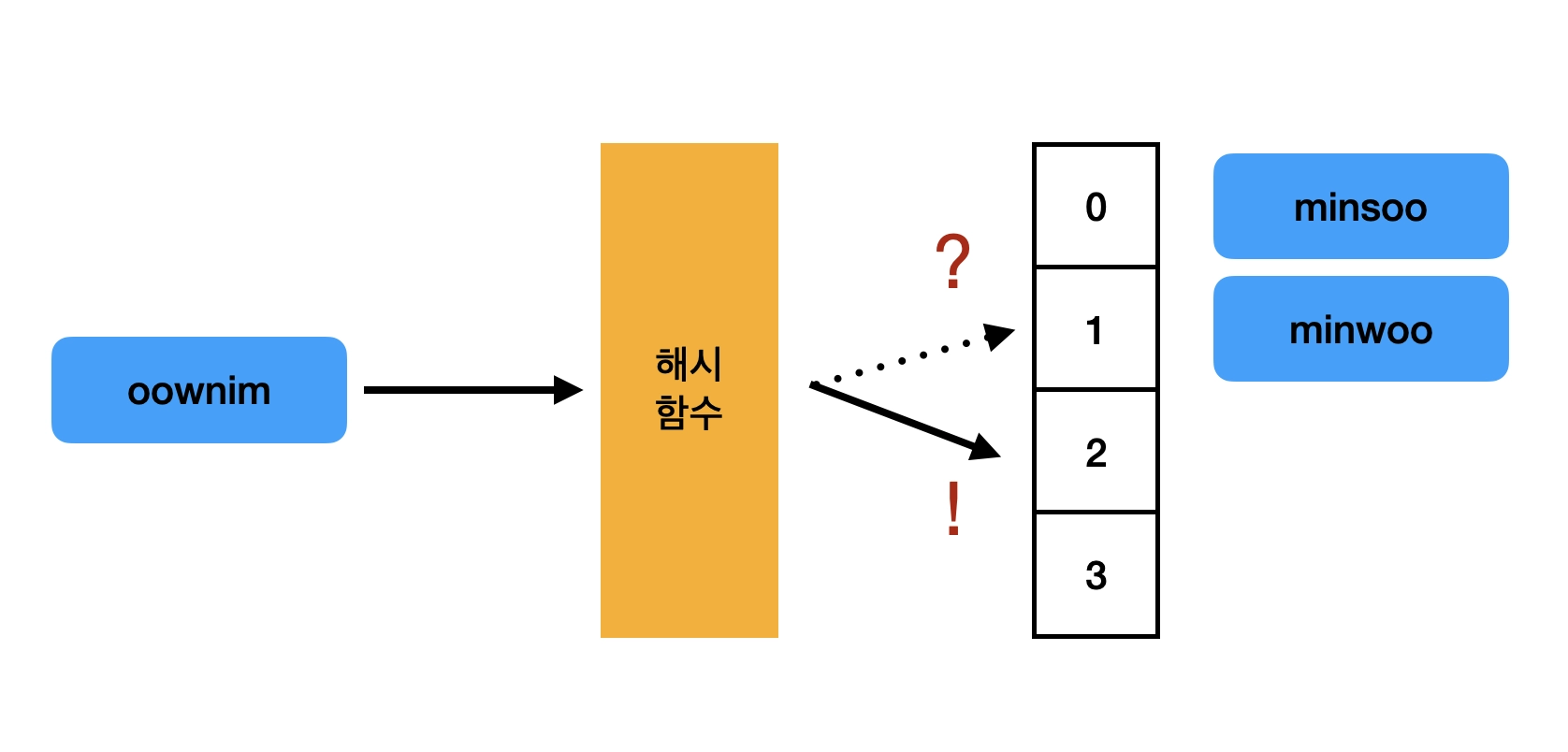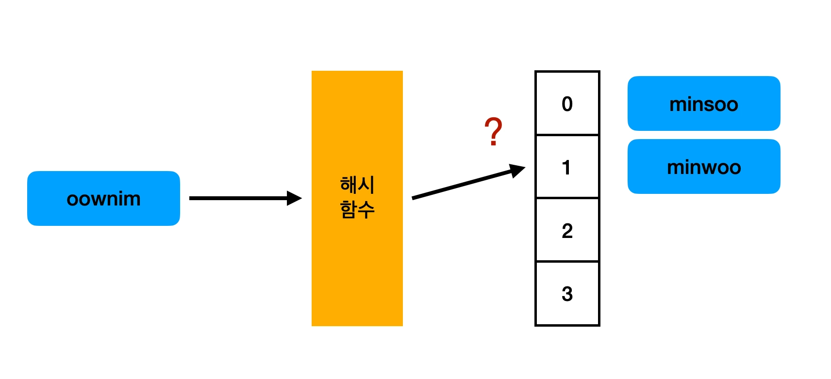 위 해시함수를 사용하면 minwoo와 oownim 의 해시값이 같아진다.