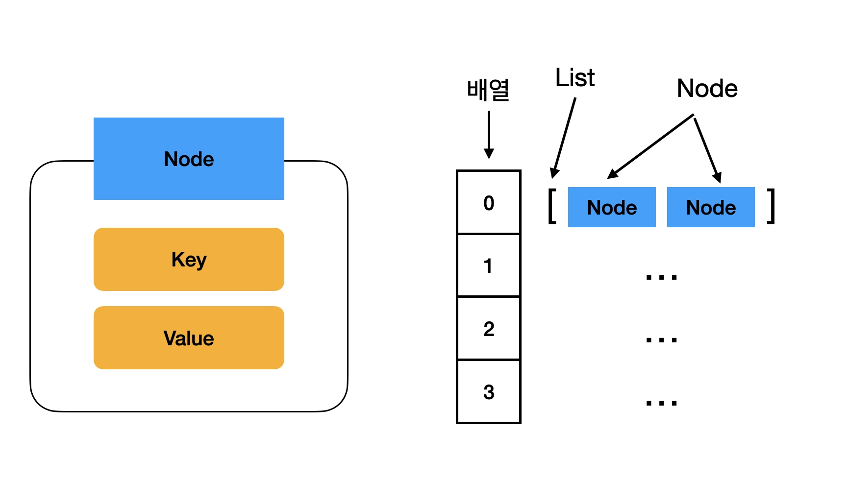 key와 value 한 쌍을 담은 Node객체를 담은 리스트의 배열…. 그림으로 보면