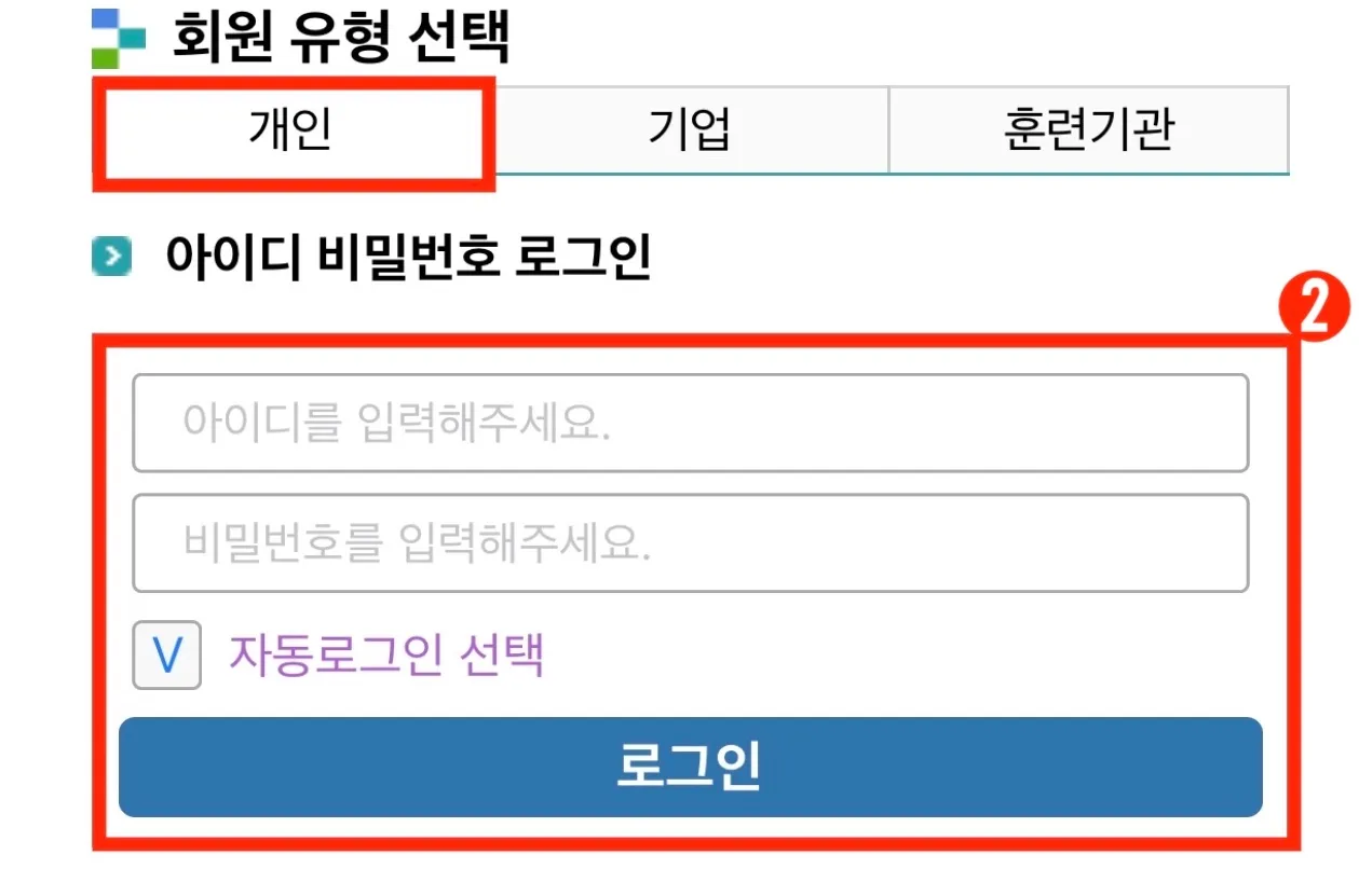 개인을 선택하고 2번란의 아이디와 비밀번호를 입력합니다.