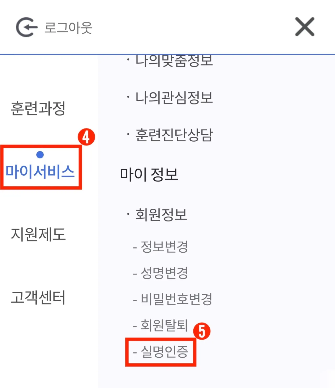 4번(마이서비스)와 5번(실명인증)을 순차적으로 누른 후 실명인증을 진행합니다.