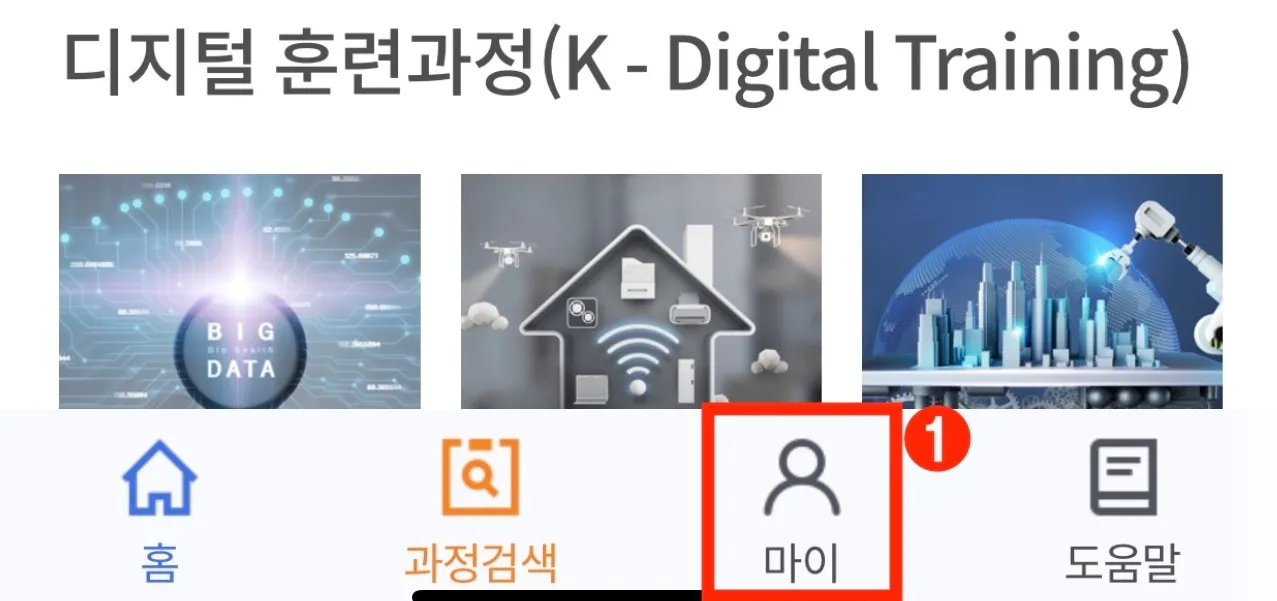 애플리케이션을 실행 후 애플리케이션 하단에 있는 메뉴 1번(마이)을 클릭 합니다.