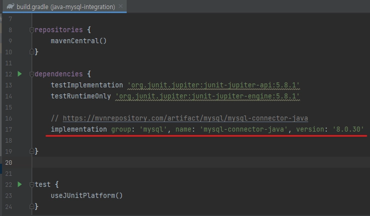 build.gradl의 dependencies에 mysql dependency를 추가해줘야 한다.