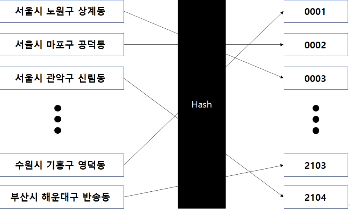 임의의 크기를 가진 데이터를 고정적인 크기의 데이터로 변화시켜서 저장하는 자료구조 입니다.