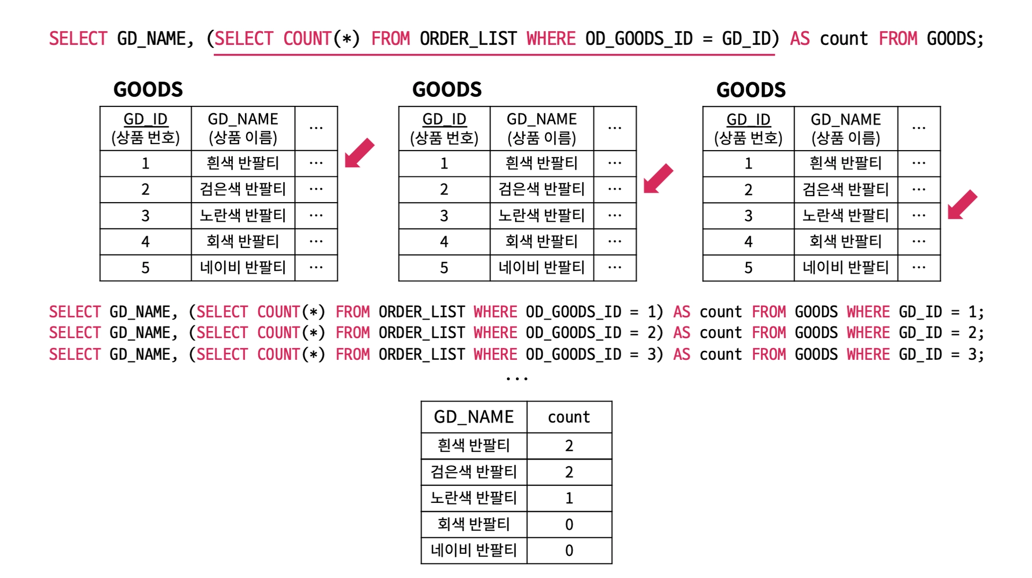 위 쿼리의 경우, OD_GOODS_ID = GD_ID 에 해당하는 GD_ID 마다 쿼리문을 수행한다.