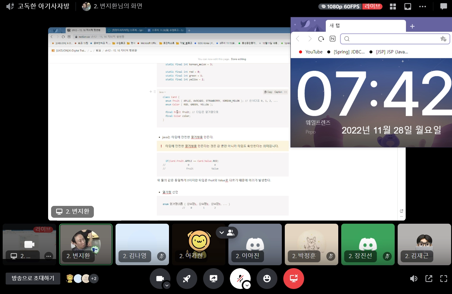 이가현 | 애너테이션을 안다고 생각하고 있었는데 발표준비하다보니깐 의미를 모르고 사용했던 부분도 있어서 확실히 정리가 되서 좋았습니다. 또, 지네릭형변환 부분은 혼자 강의 들을 때는 이해가 잘안됐었는데 지환 |
