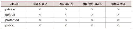 default : 동일 패키지 내에 존재하는 클래스 에서만 인스턴스 생성 가능