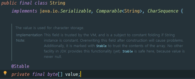 String클래스에는 문자열을 저장하기 위해서 문자형 배열 참조변수(char[]) value를 인스턴스 변수로 정의해놓고 있다. 인스턴스 생성 시 생성자의 매개변수로 입력받는 문자열은 이 인스턴스변수(value)에 문자형 배열 (char[])로 저장된다.