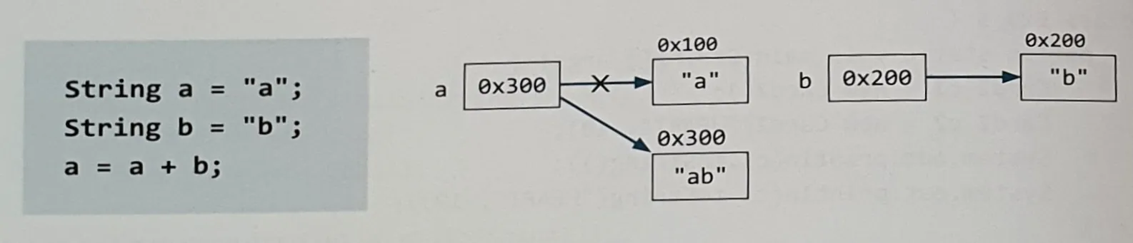 아래의 코드와 같이 ‘+’연산자를 이용해서 문자열을 결합하는 경우 인스턴스 내의 문자열이 바뀌는 것이 아니라 새로운 문자열(’”ab”)이 담긴 String인스턴스가 생성된다.
