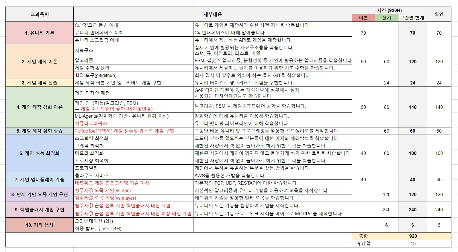 강조점: 훈련생 학습 상황에 따라 다양한 프로젝트 진행이 가능함 (예: 테트리스, 레이싱, 슈팅, FPS, 로그라이크 등)