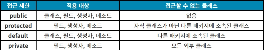 접근제어자는 멤버 또는 클래스에 사용되어 해당하는 멤버 또는 클래스를 외부에서 접근하지 못하도록 제한하는 역할을 함