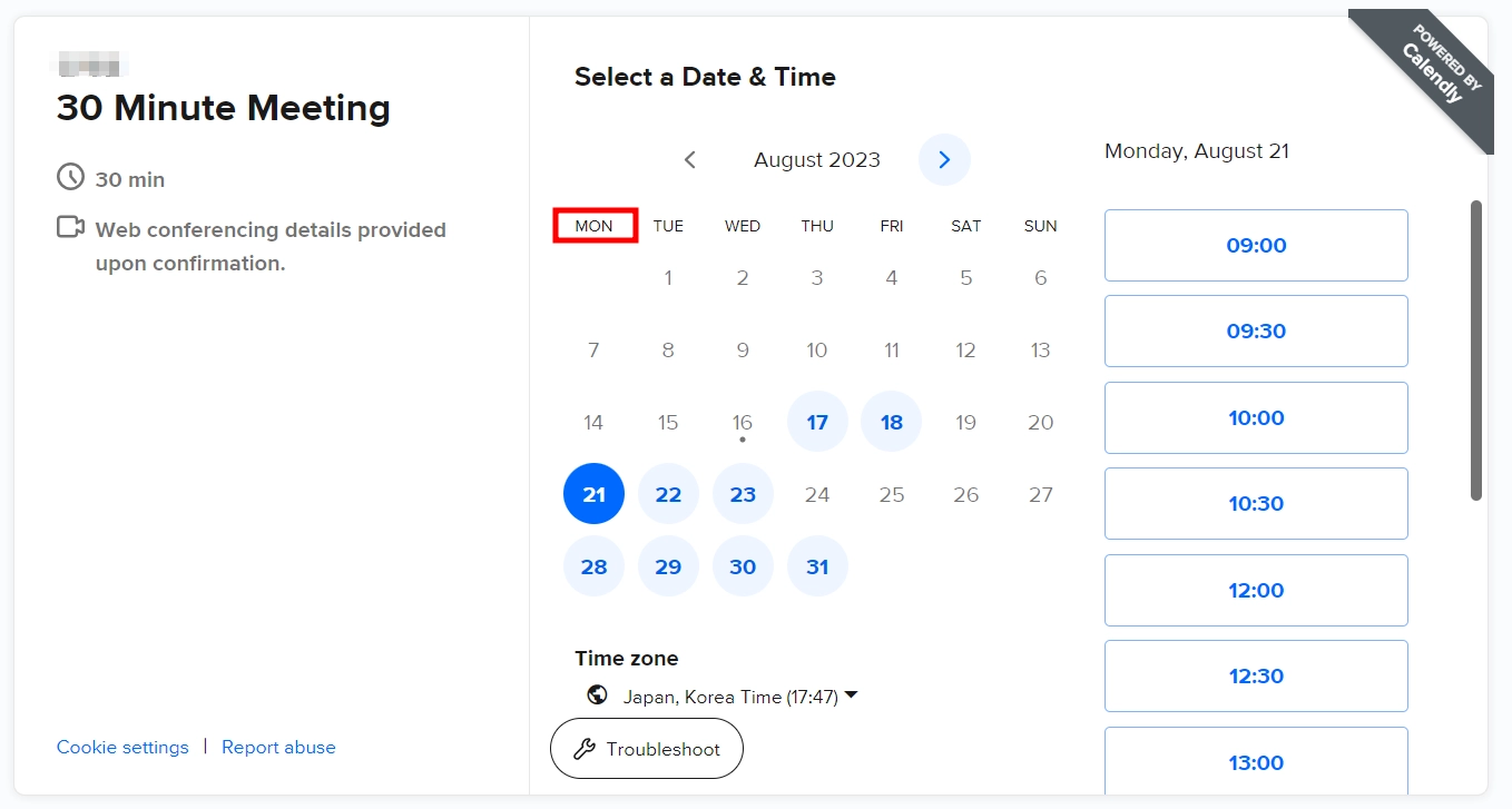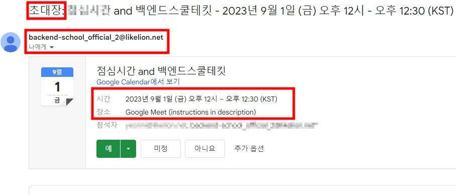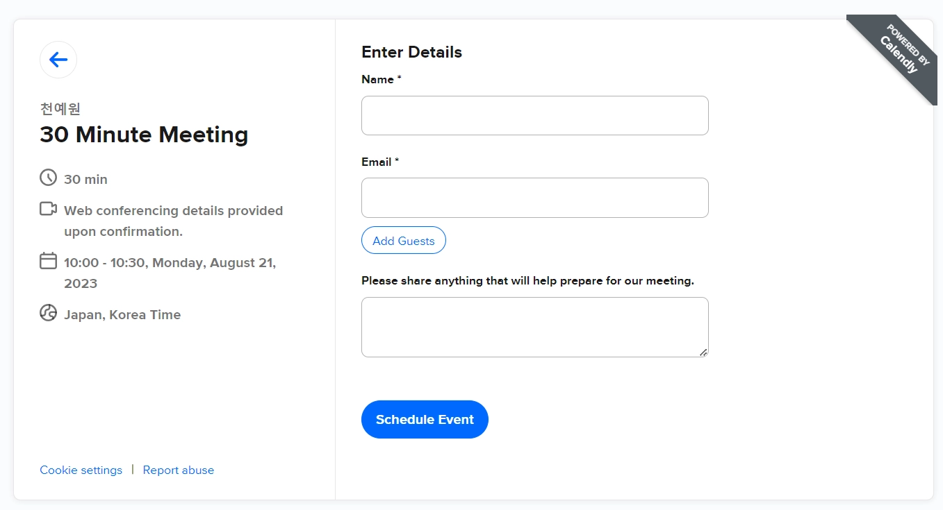 이름, 본인이 사용하는 이메일을 입력하고 Schedule Event 버튼을 눌러 예약을 마칩니다.