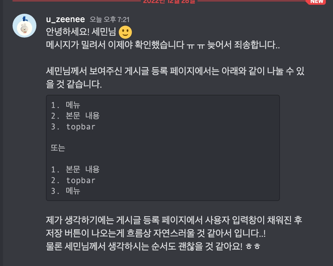 이미지 첨부 컴포넌트: 회원가입/로그인 후 프로필 설정, 게시글, 상품 등록 등 되게 많이 쓰이는데, 이미지 첨부 컴포넌트가 재활용이 잘 안 되고 있음. 추후 여러 이미지 첨부 고려해서 하나로 합치면 좋을거 같음