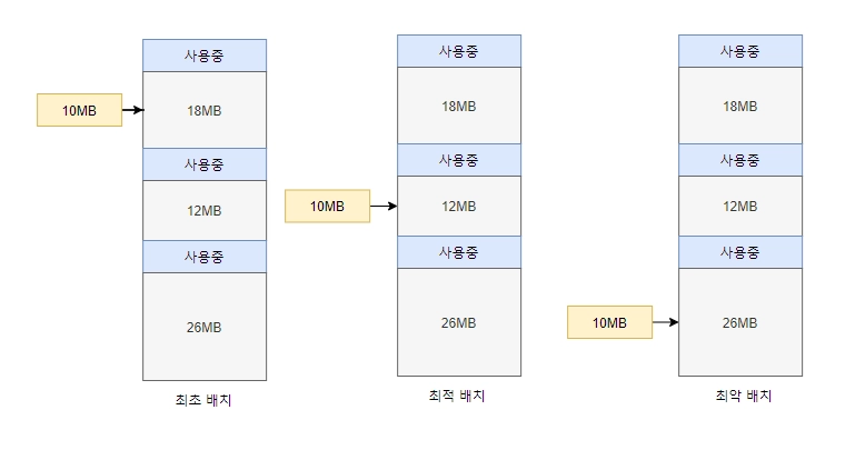 이 중 최적 배치는 메모리의 빈 공간을 모두 확인 한 후 적당한 공간 가운데 가장 작은 공간에 프로세스를 배치하는 방법이다.