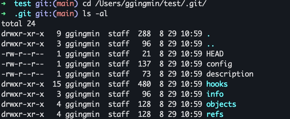 2) 출력된 경로를 확인하면 .git 이라는 폴더가 생성된 것을 확인할 수 있습니다. 해당 저장소와 관련된 메타 정보들이 저장되는 곳입니다.