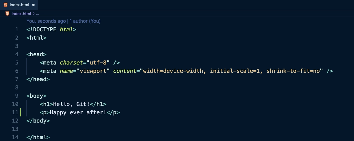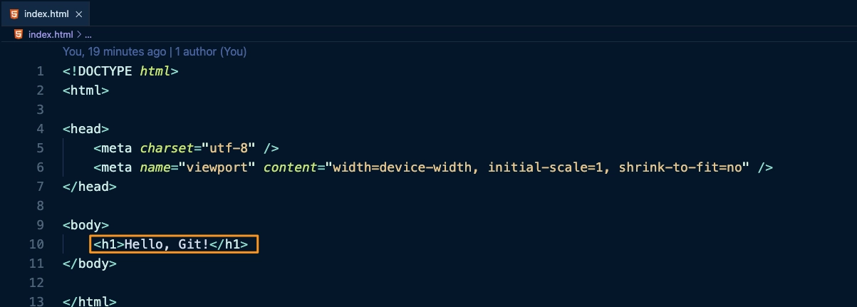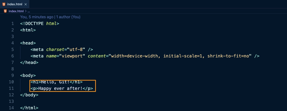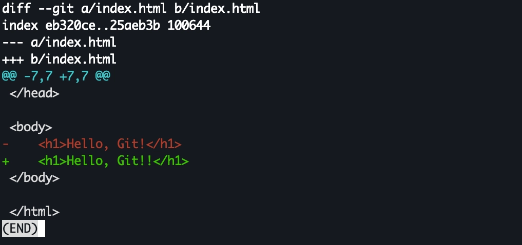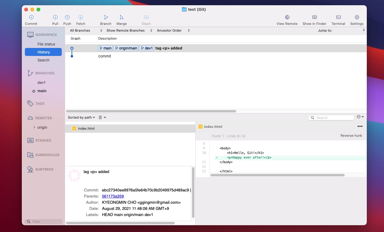 2) 변경된 브랜치 상태에서 index.html 파일을 일부 변경한 후에 추적 및 commit 을 수행합니다.