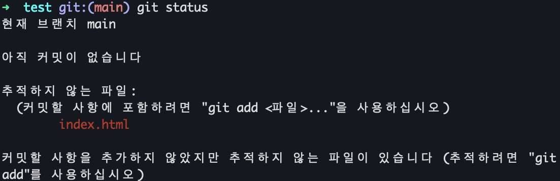 2) 동일한 디렉토리 내에 index.html 파일을 하나 만들어 주고 다시 명령을 실행합니다. 새로운 파일이 추적하지 않는 파일 이라고 메세지가 뜹니다. 여기서 추적하지 않는다는 것은 Staging Area에 아직 소스코드가 올라가지 않았다는 뜻입니다.