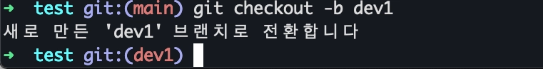 1) dev1 라는 브랜치를 새로 생성함과 동시에 그곳으로 브랜치를 이동하는 명령을 실행해보겠습니다.