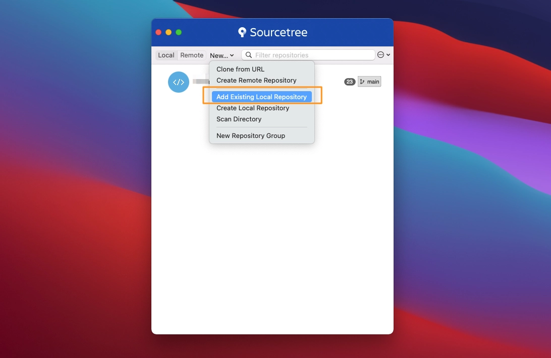 1) 메인 화면에서 Add Existing Local Repository 를 클릭합니다.