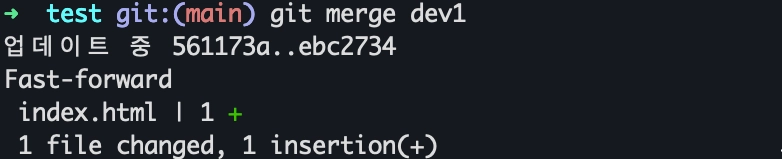 브랜치 별로 작업이 완료되면 소스를 하나로 병합해주어야 합니다. main 브랜치로 돌아간 상태에서 dev1 의 작업내용을 합치기 위해 다음의 명령을 실행합니다. dev1 에서 작성했던 소스가 나오면 정상입니다.