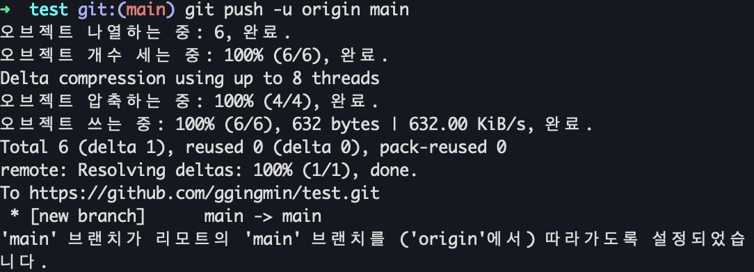// -u 옵션을 사용하면 추후 동일한 원격 저장소와 브랜치에 push 할 때 git push 만 실행할 수 있습니다.