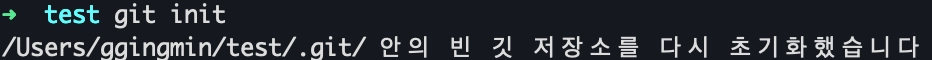 내가 작업하고 있는 프로젝트 디렉토리를 git이 관리하는 영역으로 만들어주기 위해서는 초기화를 해주어야 합니다. 출력되는 메세지는 운영체제 환경에 따라 영문일 수도 있습니다.