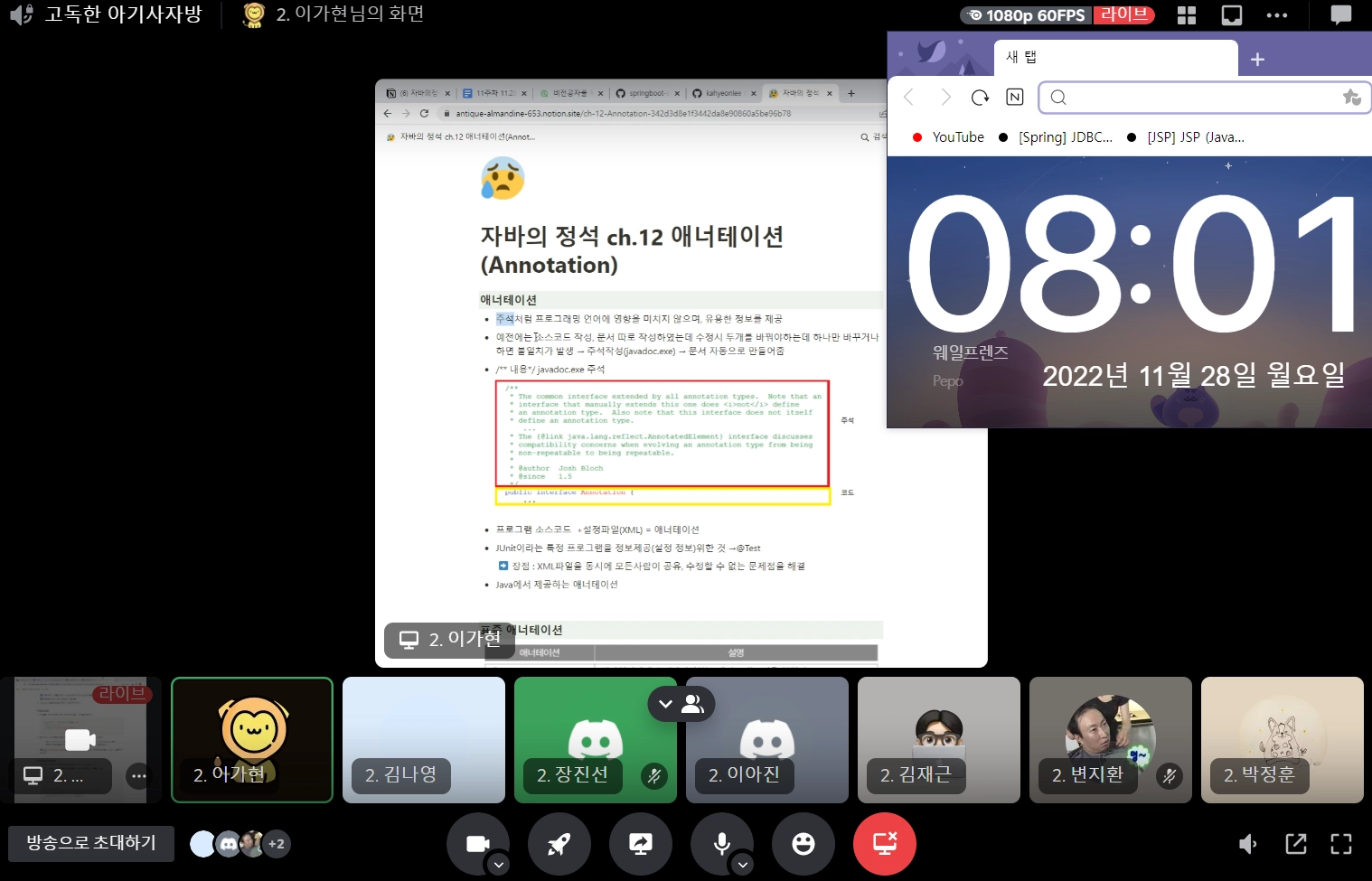 김나영 | 제네릭은 이제 많이 써서 익숙하다 생각했는데 익숙한 것과 잘 아는 것은 큰 차이가 있었던 거 같다.. 지환님이 발표를 하시면서 질문을 하셨는데 머리 속으로 생각 했던 답과 달라서 난 하나도 모르는구나..라는 생각이 많이 들었다. 지환님이 정리를 잘 해주셔서 제네릭은 많이 정리가 되었고 어노테이션 부분도 가현님이 |