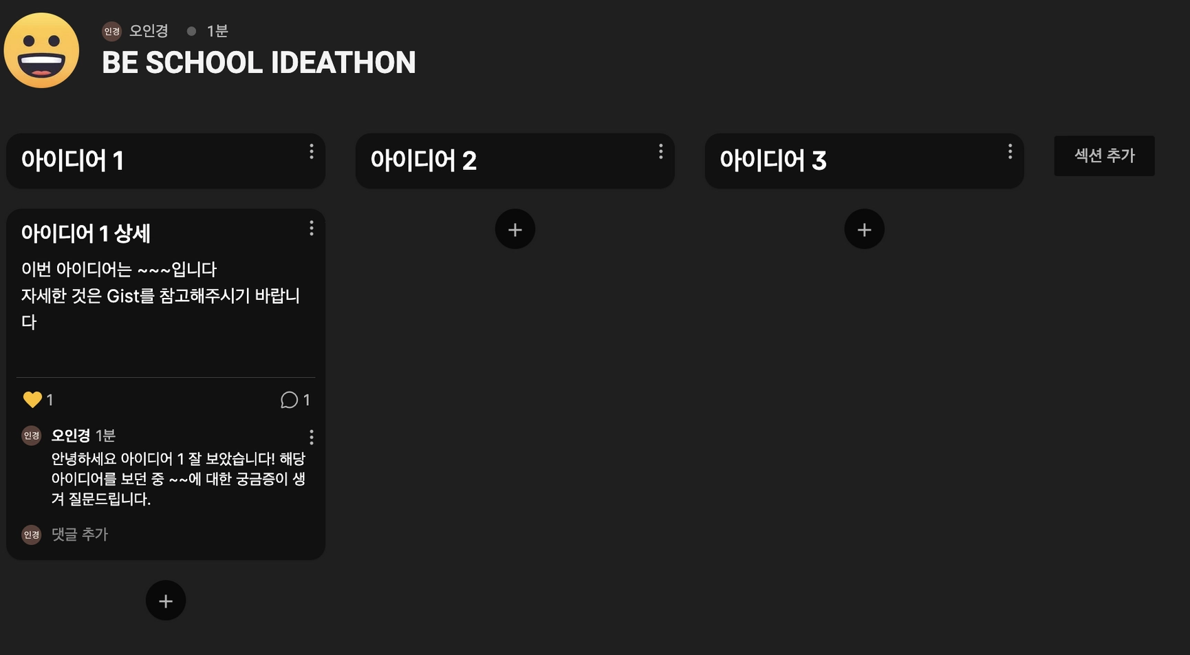 작성해주신 리뷰는 아이디어를 제안한 훈련생분께 정리해서 전달드릴 예정입니다. 최대한 성의있게, 정돈된 문장으로 작성해 주시면 감사드리겠습니다