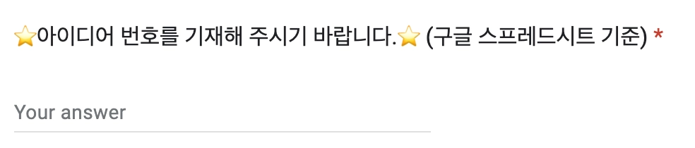 선택한 아이디어 5개 중 본인이 가장 관심이 있는 아이디어 번호 1개만 구글 스프레드 시트 기준으로 기재해주시기 바랍니다.