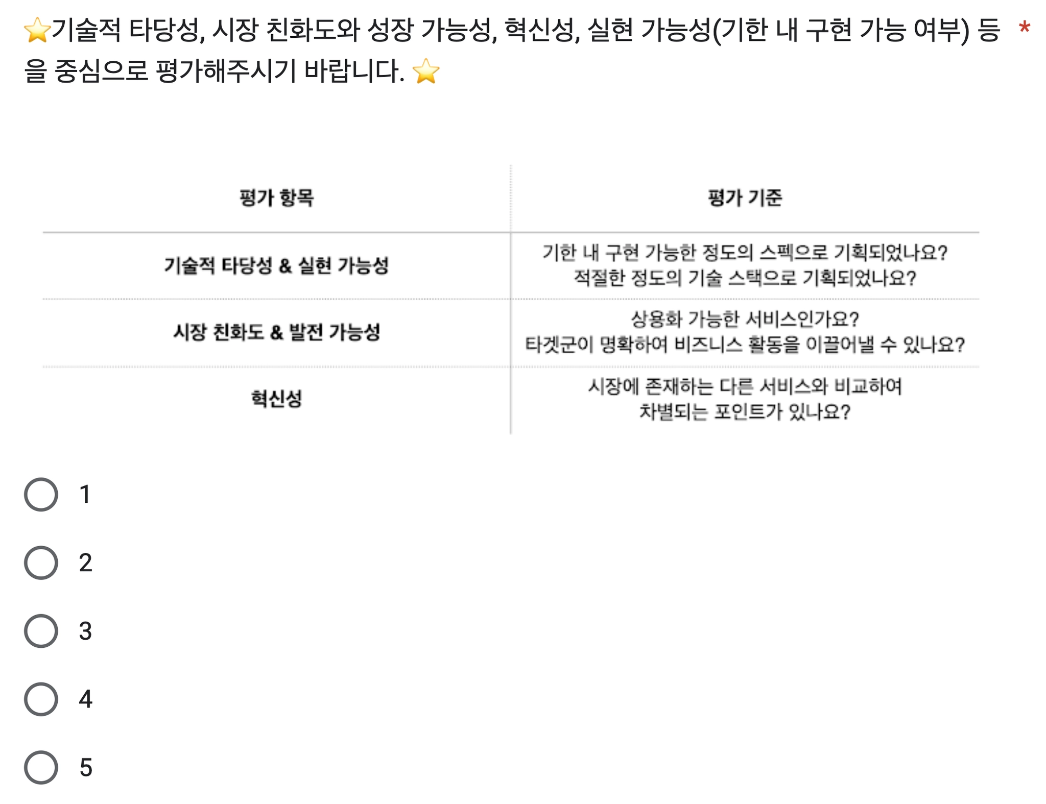 기술적 타당성, 실현 가능성, 시장 친화도와 발전 가능성, 혁신성 등을 중심으로 1~5점 내 평가를 진행해 주시기 바랍니다. (필수)