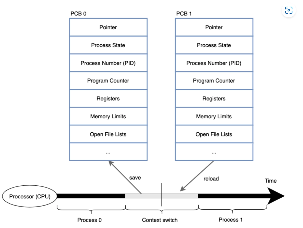 실행 상태에서 나가는 프로세스 제어 블록(PCB) 에는 지금까지의 작업 내용을 저장하고, 실행 상태로 들어오는 프로세스 제어 블록의 내용으로 CPU를 다시 세팅하는 것