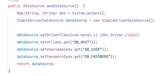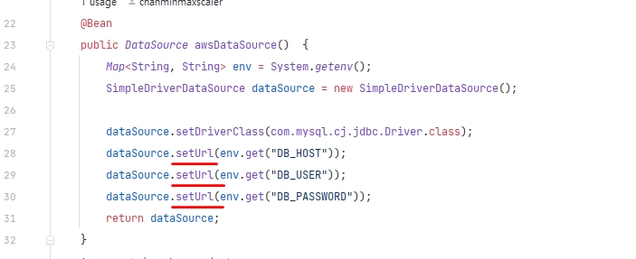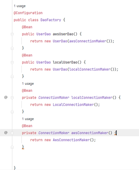 처음 함수를 작성할 때 localConnectionMaker(), awsConnectionMaker()는 클래스 외부에서 호출될 일이 없을 것이라 생각해 접근제어자를 private로 설정하였다. 그러나 여기에 @Bean을 붙이기 위해서는 접근제어자를 public으로 변경해주어야 한다. @Bean이 클래스의 외부인 ApplicationContext에서 관리하는 함수라는 표시이기 때문이다.