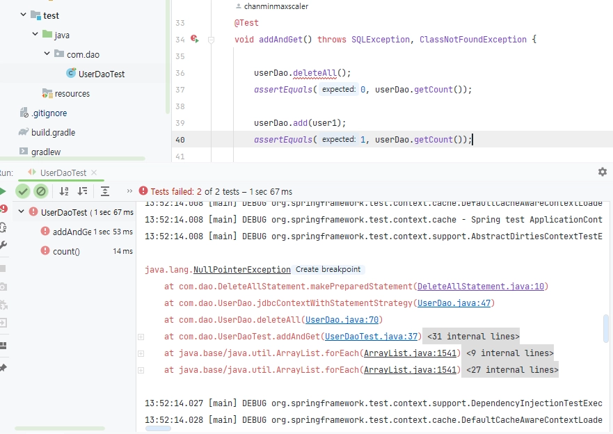 처음에는 deleteAll()에 빨간줄이 그어져 있어 테스트코드에서 userDao의 객체가 비어있다고 생각했다. 그러나 원인은 다른 곳에 있었다. 오류메시지가 링크로 원인을 알려주었다.