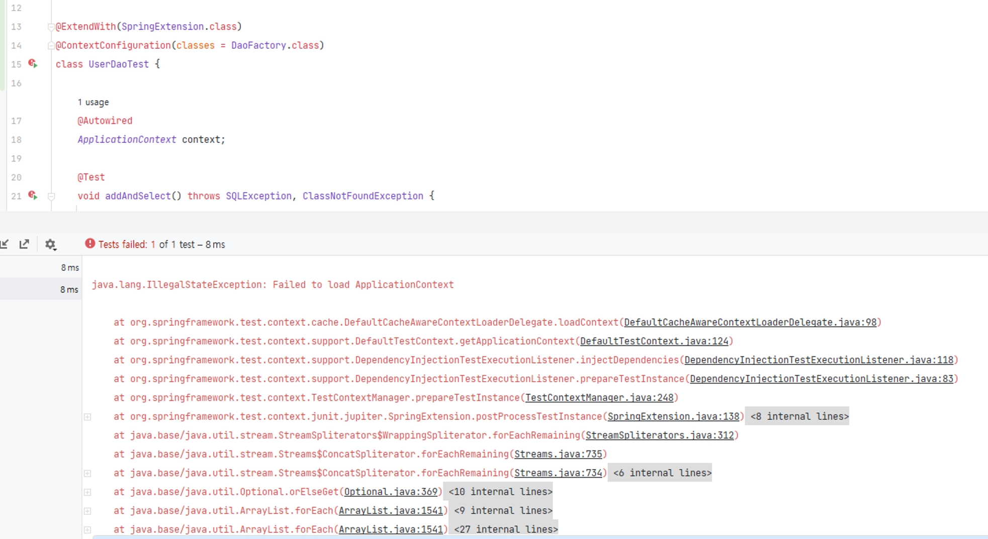 DaoFactory 클래스에 DataSource를 적용하기 위해 ConnectionMaker를 사용하던 기존의 방법을 수정하였다. 그 후 Test 코드를 실행했고 다음과 같은 에러메시지를 받았다.