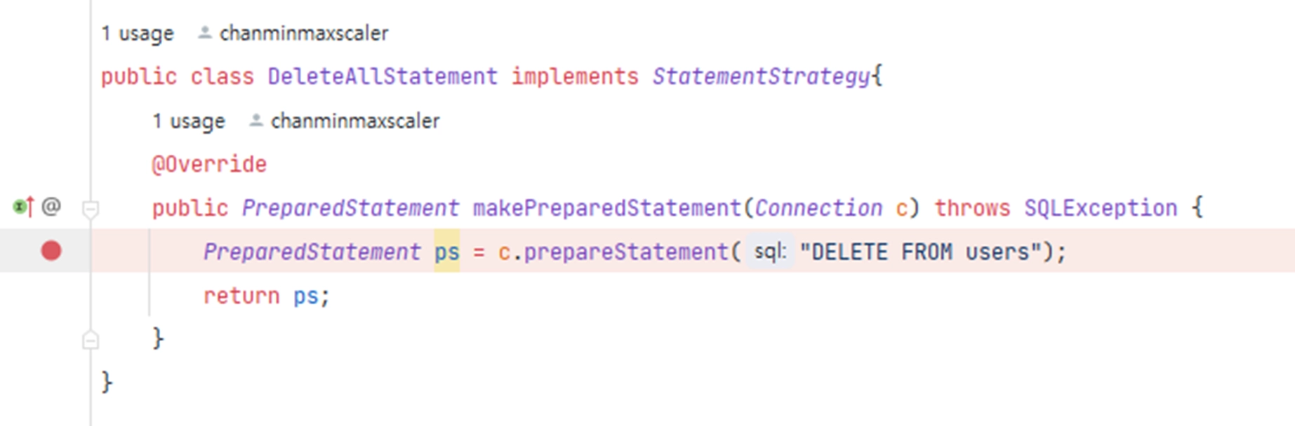 AddStatement, DeleteAllStatement는 StatementStrategy 인터페이스의 구현 클래스이다. makePreparedStatement() 메소드를 오버라이드함으로써 add(), deleteAll() 기능에 필요한 SQL 구문과 설정을 담고 있다.