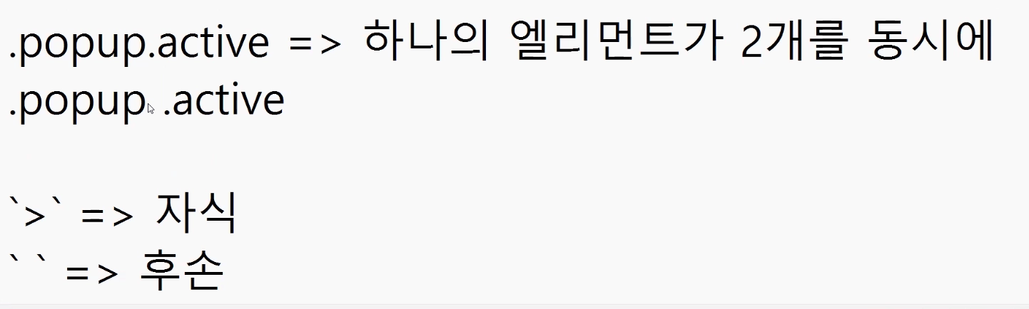 : popup. active: popup 클래스의 후손 중에 active를 가진 요소들을 탐색
