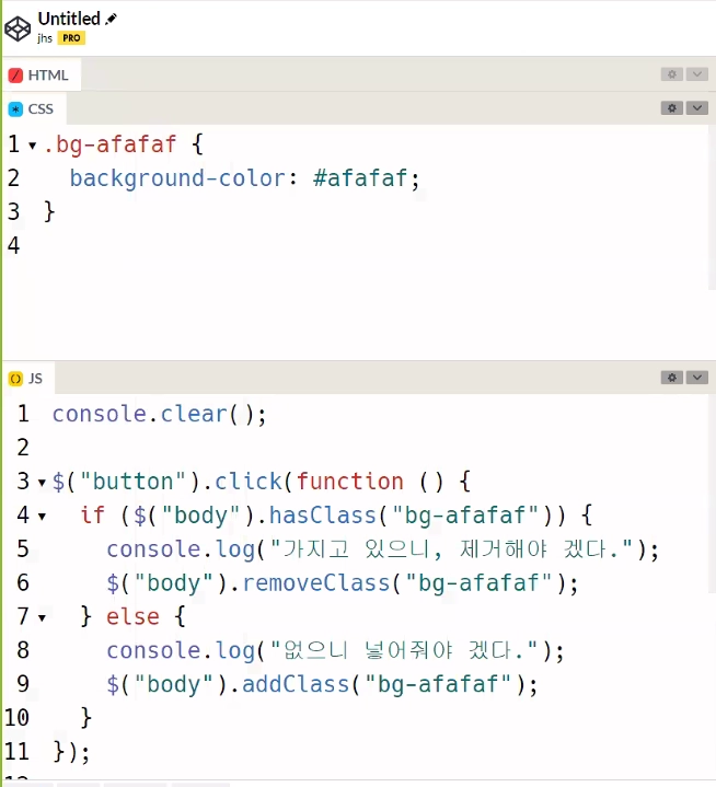 js에서 .addclass(css) 하는 이유: css 수정이 용이함(넣고 빼는 것이 용이)