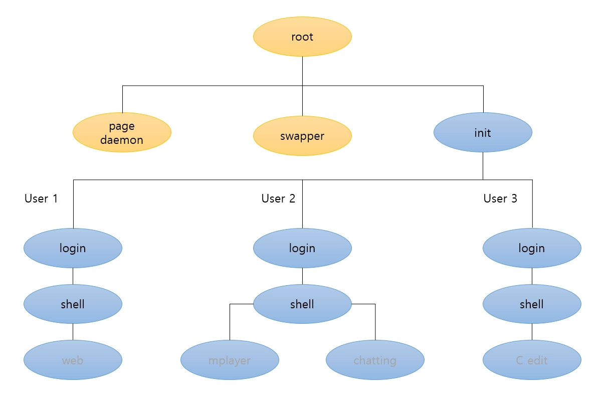init 프로세스를 전체 프로세스의 출발점으로 갖고, 나머지 프로세스들은 init 프로세스의 자식이 된다.