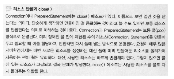에러가 발생하든 발생하지 않든, 커넥션과 PreparedStatement, ResultSet과 같은 클래스는 풀에 있는 위에서 언급한 것과 같이 정해진 풀 안에 제한된 리소스를 만들어두고, 필요할 때 할당하고 반환하면 다시 풀에 넣는 방식으로 사용한다.