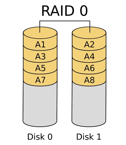 RAID 0 : 여러개의 디스크에 조각을 분배하여 저장하는 기술
