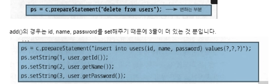 앞서 언급했듯이, UserDao 클래스의 메소드들은 PreparedStatement를 사용하는 부분이 각 메소드에 따라 달라지고 있습니다.