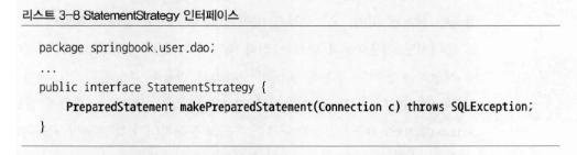 메소드에 따라 PreparedStatement 부분만 바뀌기 때문에 PreparedStatement를 리턴하는 StatementStrategy 인터페이스를 도입합니다.