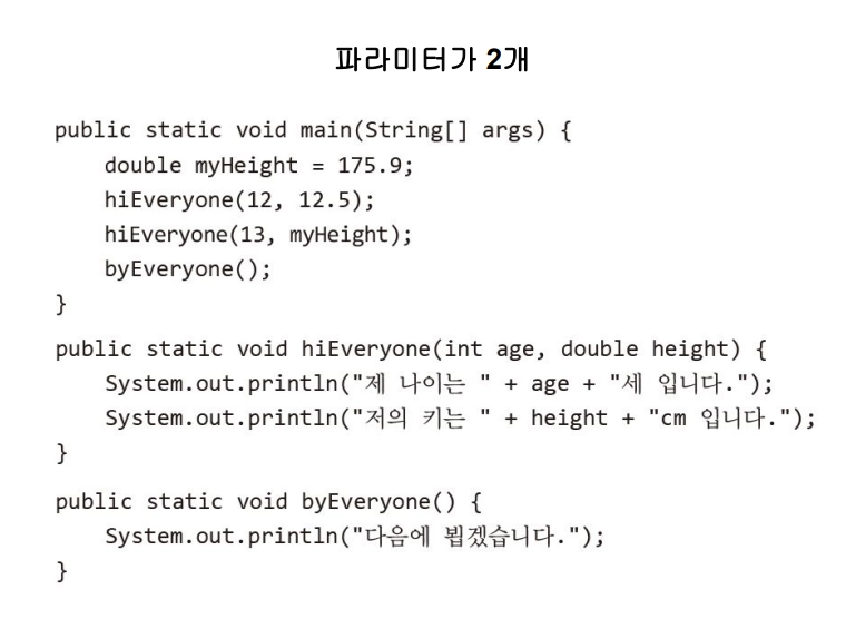 같은 이름이지만 인자의 갯수와 매개 변수 타입이 다른 것이 메소드 오버로딩 입니다.