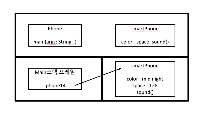smartPhone iphone14가 실행되어 smartPhone객체에 대하나 참조변수 iphone14를 만들었다